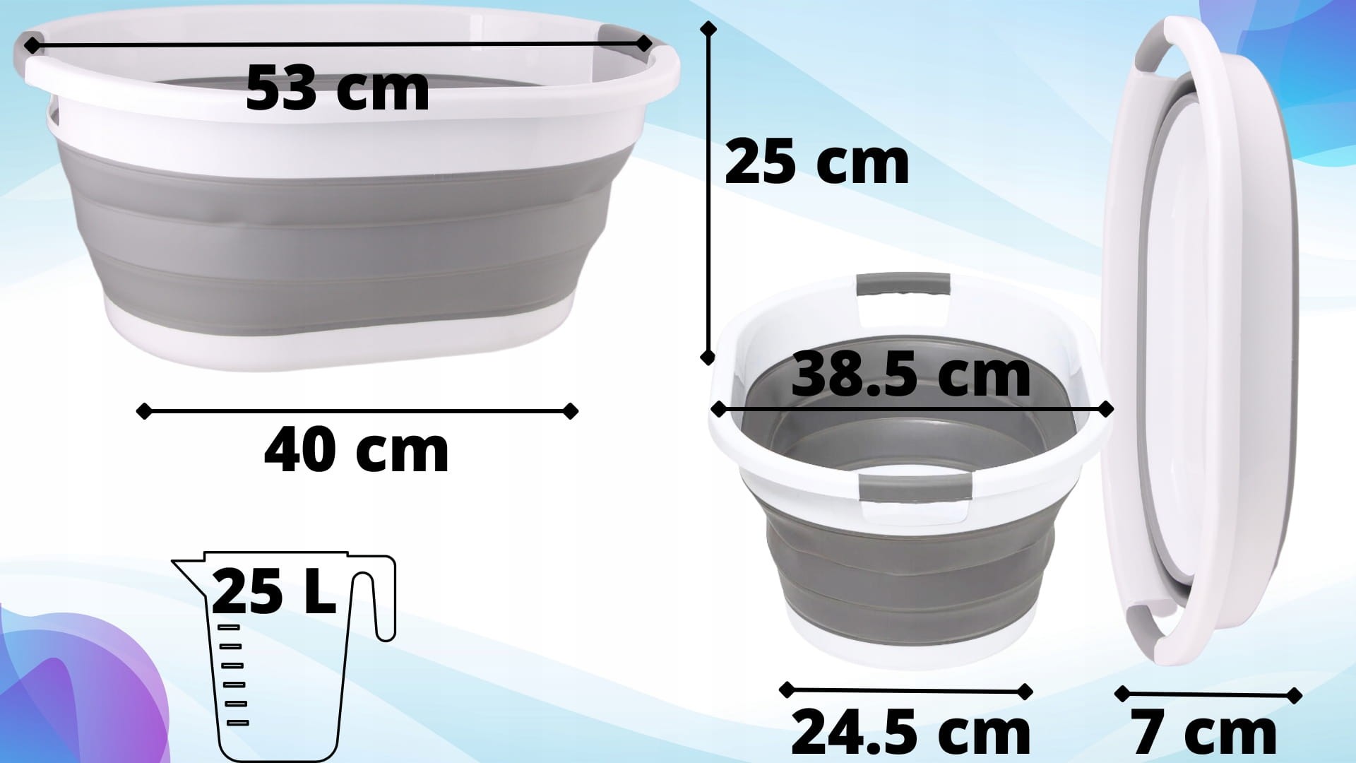 Zastosowanie » uniwersalne | Pojemność » 25L | Materiał » silikon+tworzywo sztuczne | Składana » 3 poziomy wysokości: 7-16-25cm| Wymiary » 53 x 25 x 38.5 cm (dł x wys x szer)