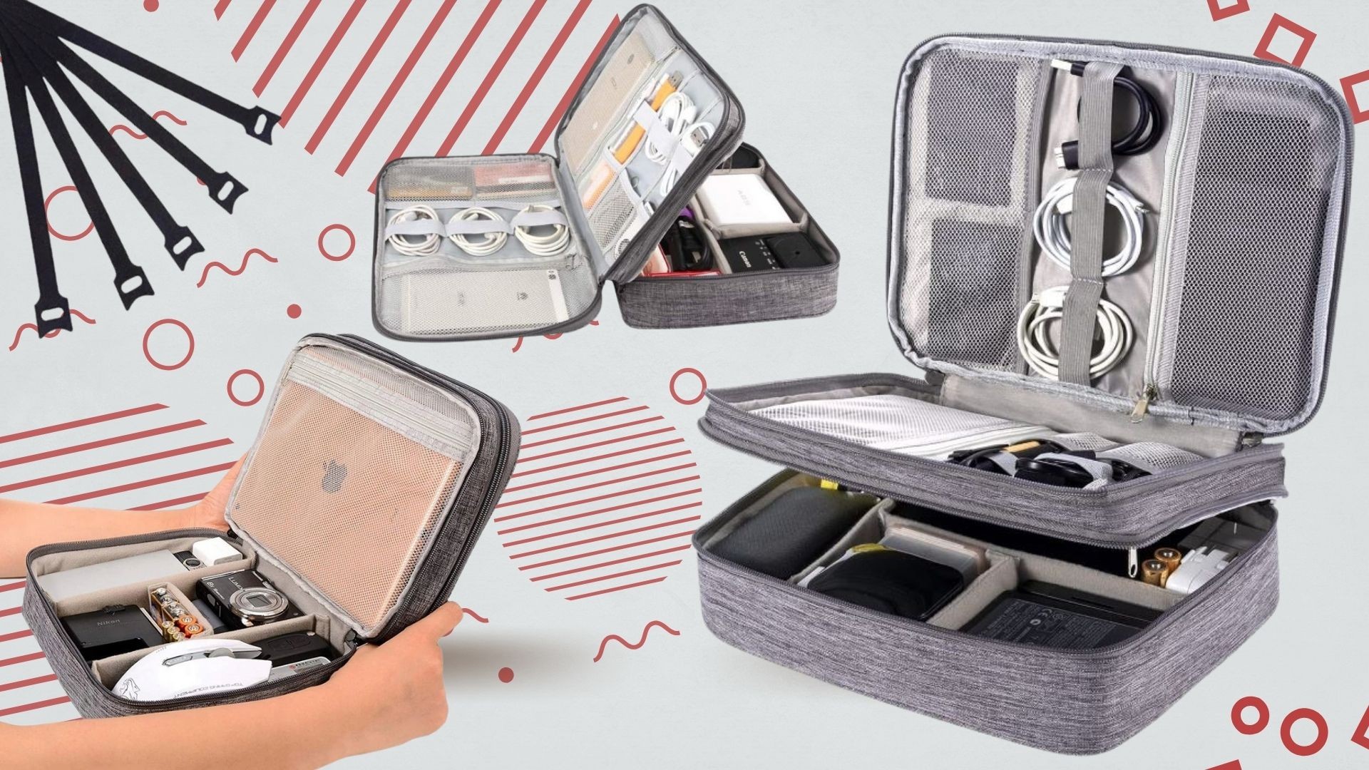 Nasz Organizer posiada dwie warstwy z niezliczoną ilością przegródek, kieszonek zapinanych na zamek, elastycznych pasków do przechowywania kabli