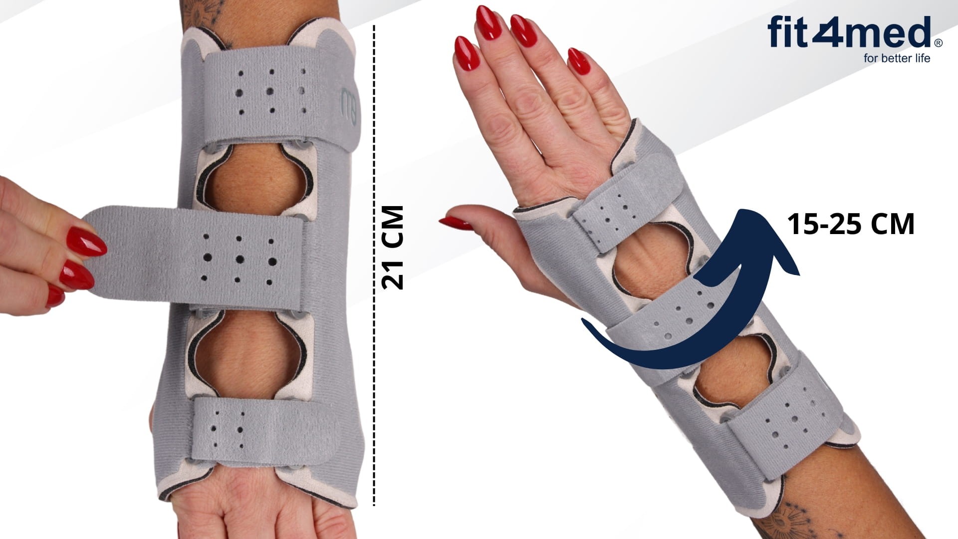 - Szeroki zakres regulacji i stabilizacji - zapięcie ortezy wykonano przy użyciu zespołu trzech taśm obwodowych. Zakres regulacji zapięć jest bardzo duży i zapewnia idealne dopasowanie do gabarytów ręki
