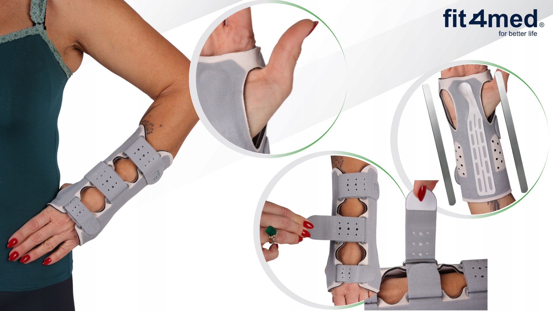 - Dodatkowe dwie szyny grzbietowe stanowią dodatkową stabilizację, która zwiększa bezpieczeństwo, a przy tym pozwala na normalne funkcjonowanie chroniąc tym samym przed niekontrolowanym odwiedzeniem i przywiedzeniem nadgarstka.