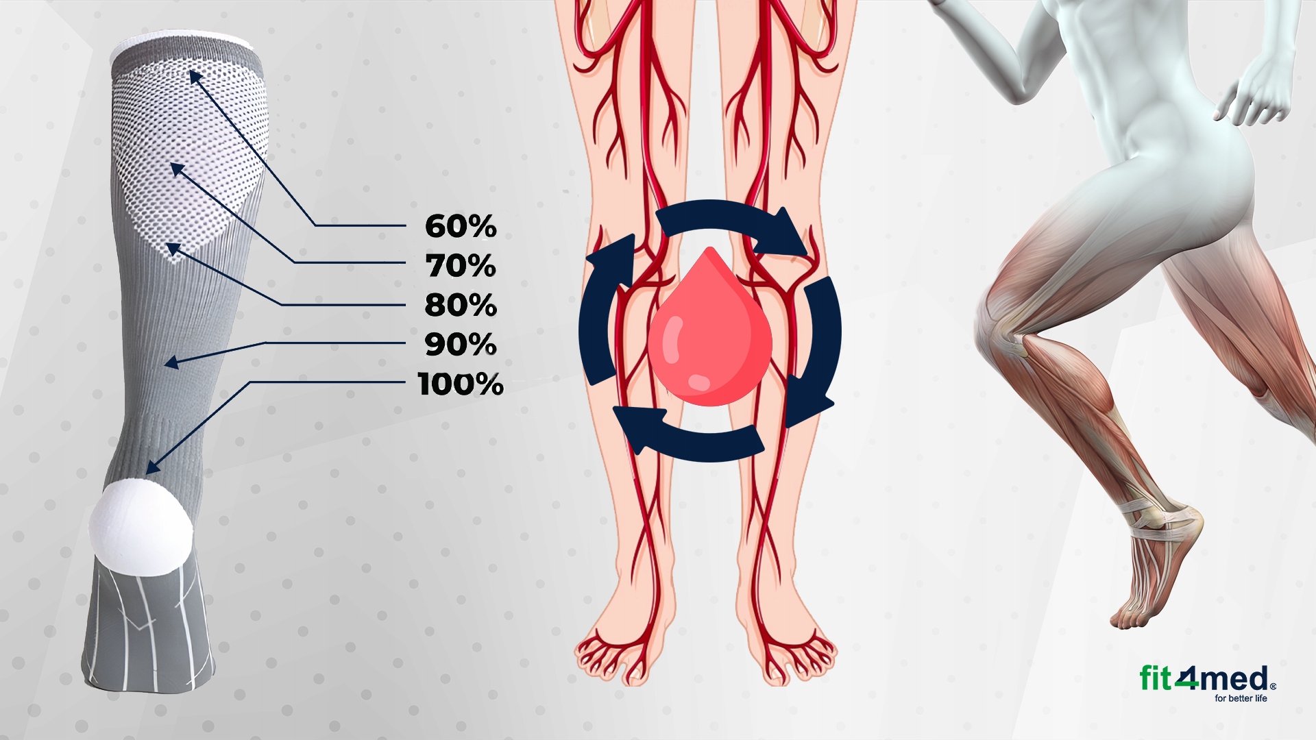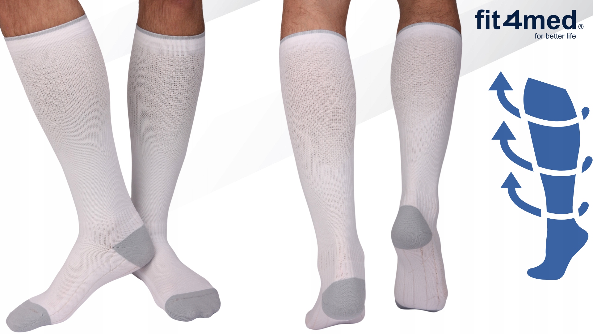 - Stopniowany ucisk - Umożliwia poprawę przepływu krwi i redukcję obrzęków, co zmniejsza uczucie zmęczenia i ciężkości w nogach, szczególnie po długim dniu pracy lub wysiłku fizycznym