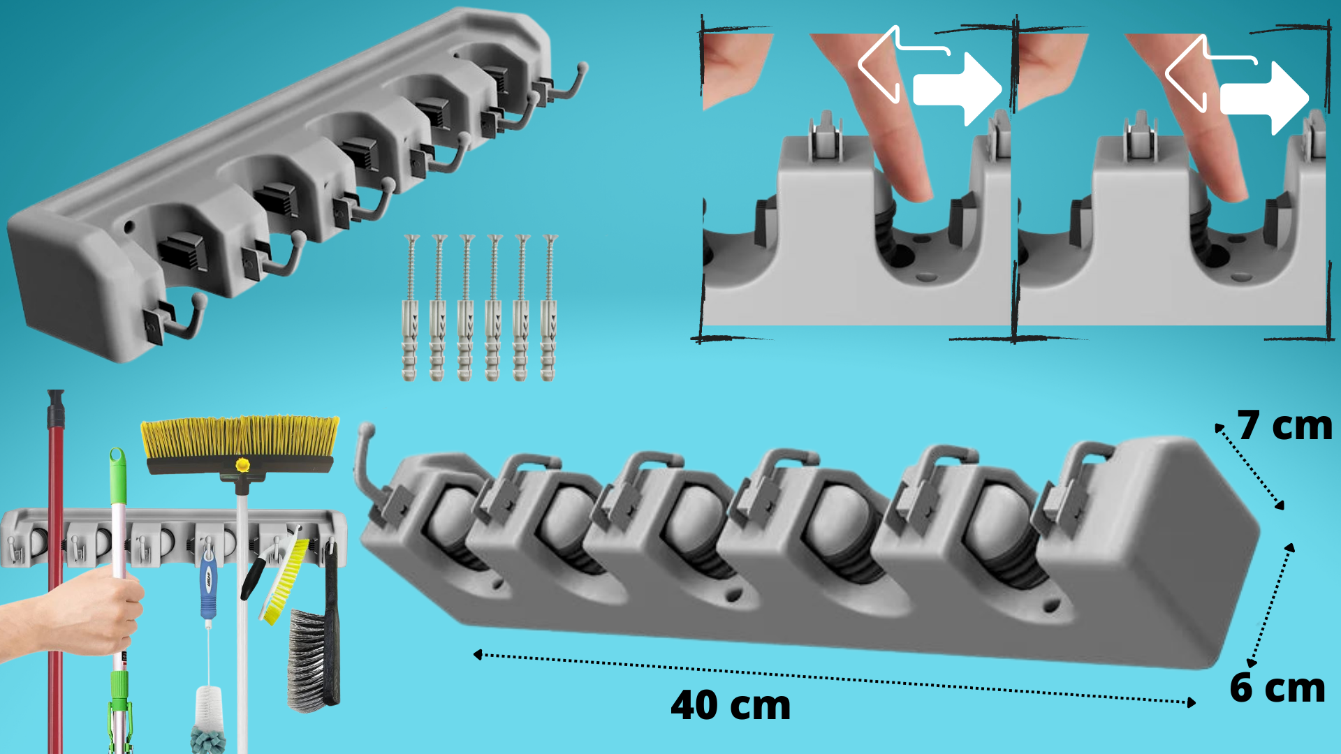 ✅Organizer posiada 5 automatycznych uchwytów, które same dostosują się do grubości trzonka (do maksymalnie 3,5 cm), dzięki samozaciskowej kulce oraz gumie ze stoperem. Dodatkowo Uchwyt posiada dodatkowo 6 małych wysuwanych wieszaczków, do zawieszenia ściereczki lub innych drobnych akcesoriów gospodarstwa domowego.