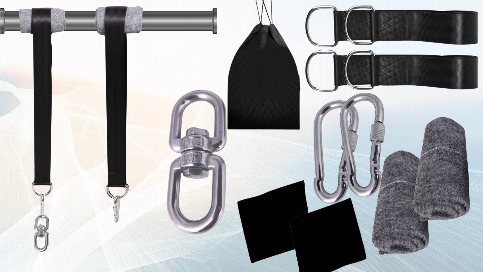 Zestaw do zawieszenia huśtawki/hamaka – taśmy 300 kg, karabińczyki, uchwyt 360°