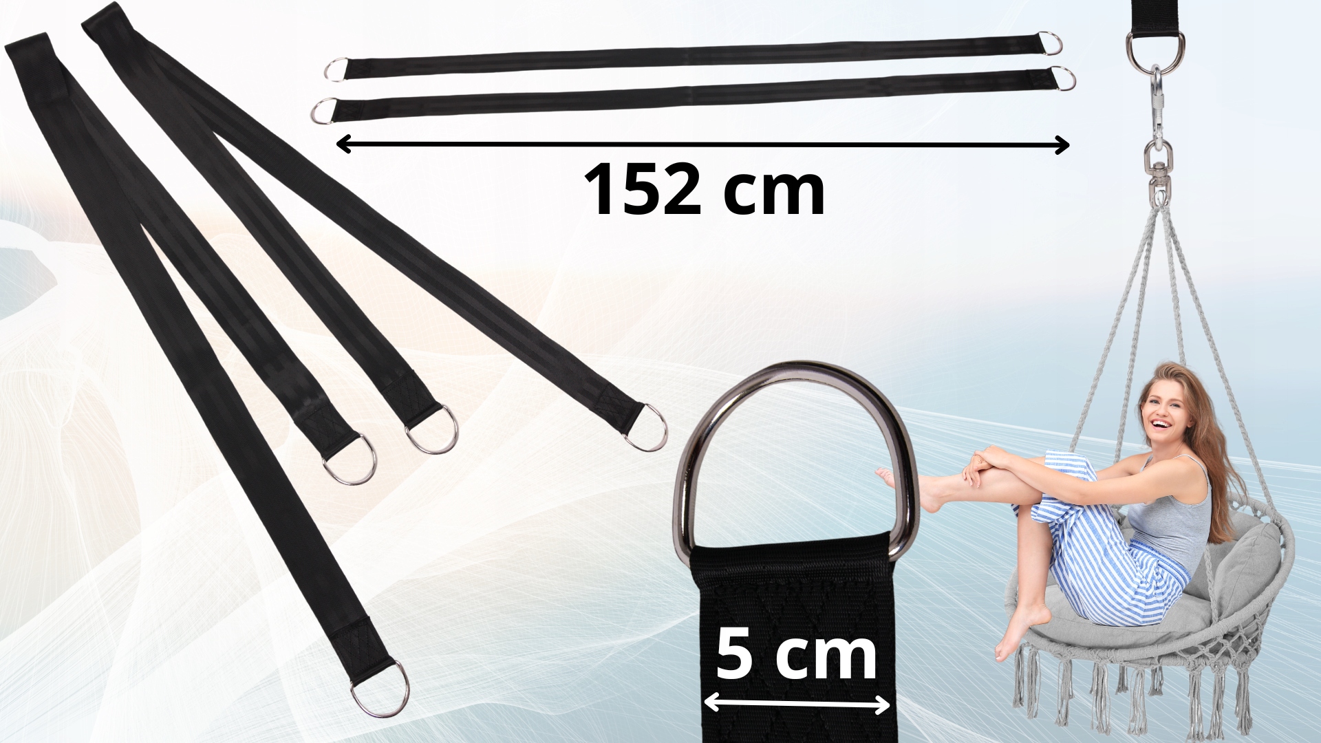 - ✅Łatwy montaż – zestaw montażowy do hamaka czy huśtawki umożliwia szybkie ich zawieszenie, bez konieczności wiercenia czy uszkadzania drzewa, a także bez potrzeby używania dodatkowych narzędzi